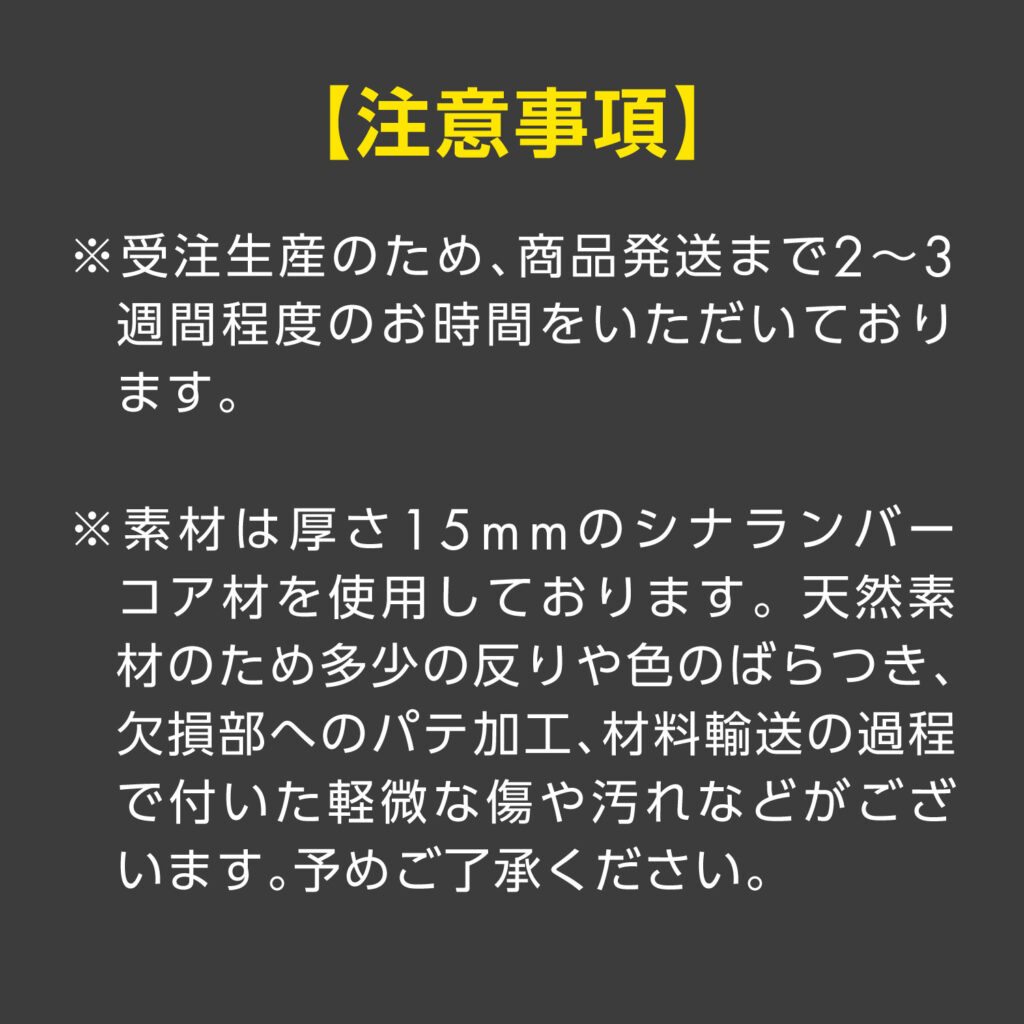 - 素材は厚さ15mmのシナランバーコア材を使用しております。天然素材のため多少の反りや色のばらつき、欠損部へのパテ加工などがございます。