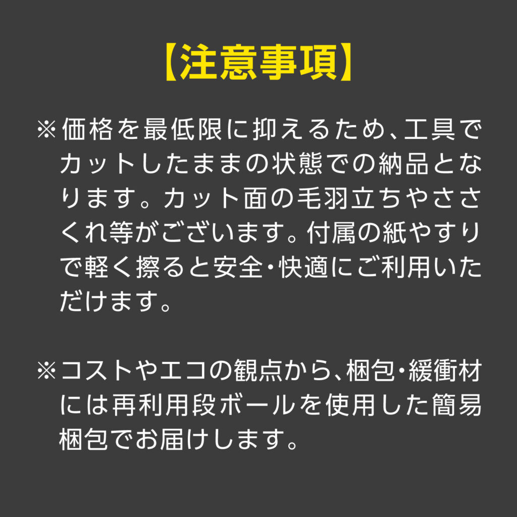 - 価格を最低限に抑えるため、工具でカットしたままの状態での納品となります。カット面の毛羽立ちやささくれ等がございます。付属の紙やすりで軽く擦ると安全・快適にご利用いただけます。
