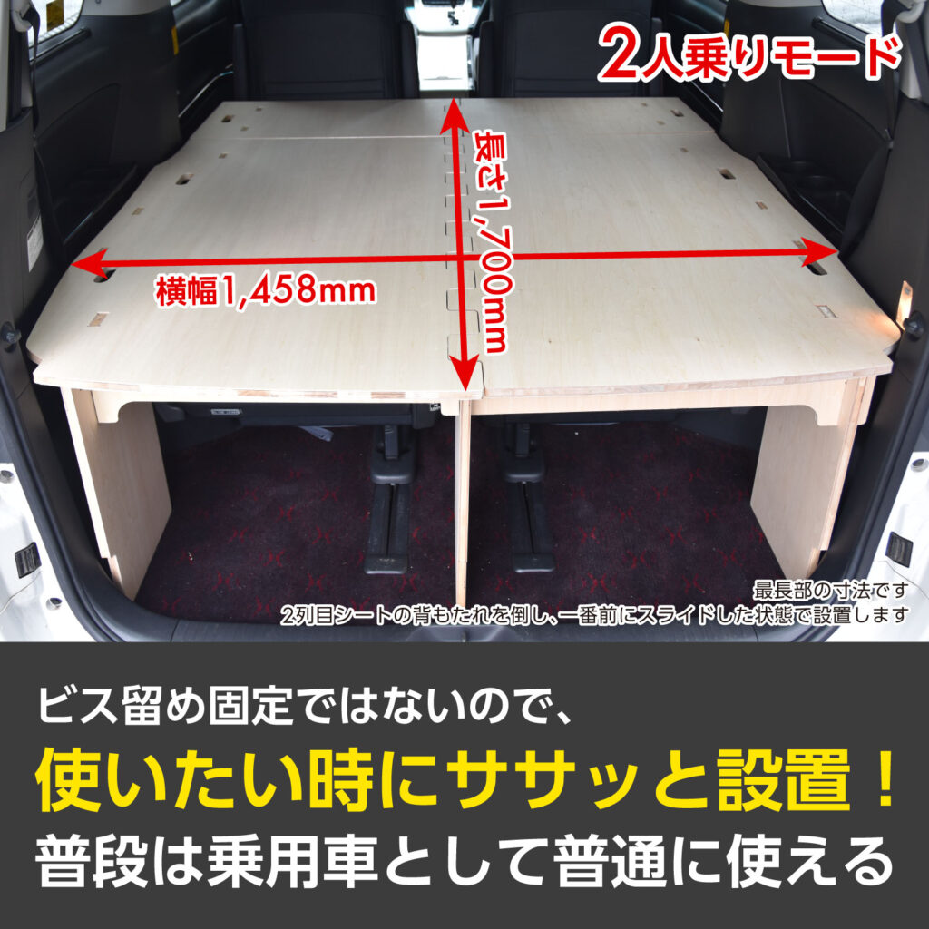 - 普段は乗用車として、キャンプや車中泊をするときにササッと組み立てて車中泊仕様に早変わり!